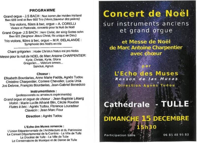 Concert de Noël sur instruments anciens et grand orgue et Messe de Noël de Marc Antoine Charpentier avec chœur par L'Écho des Muses, Resson de las Muses. Direction Agnès Tudou.