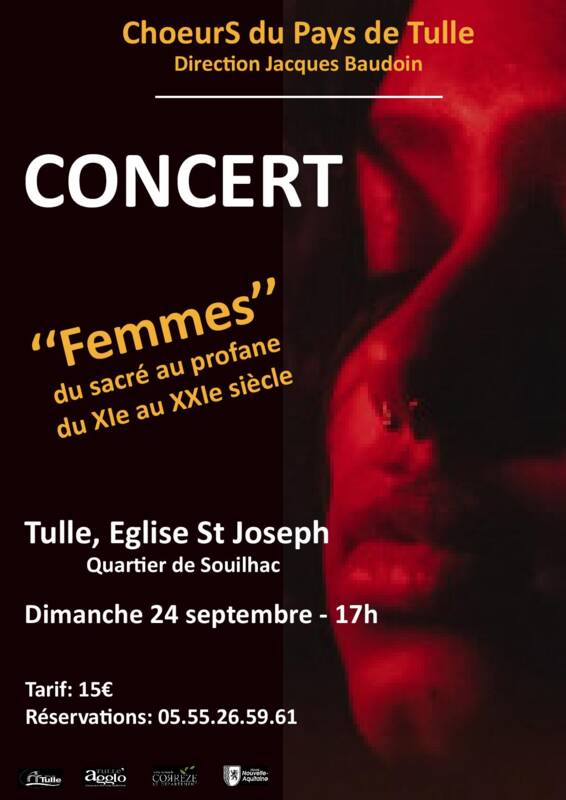 Concert "Femmes" du sacré au profane du XIe au XXIe siècle par le Chœurs du Pays de Tulle sous la direction de Jacques Baudoin - Eglise St Joseph Quartier de Souilhac - Tarif : 15 € -
