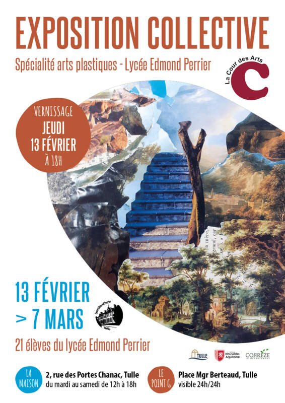 Le projet : Exposer, sortir des murs du lycée et partager sa production artistique avec le plus grand nombre. Cette année encore le thème de la "Nature à l’œuvre" est au programme du baccalauréat. Il sera donc question de nature, de feuilles, de branches, de paysages... Un second thème oriente les élèves vers "Documenter ou augmenter le réel". Comment augmenter le réel, la nature, un corps, une matière, un écrit ? Coordination de projet : Annelise Dubois Avec le lycée Edmond Perrier, Tulle. Les élèves : Tristan Blancher, Clara Dupuy, Camille Bouat-Mézard, Cassilde Chauvat, Jules Chemartin, Elise Chouzenoux, Antoine Ciappa, Luna Gabin, Mathéo Fourche, Ketsana Gella, Damien Gaucher, Lehna Jaillot, Maël Menseau, Youna Lallement, Gavroche Miranda, Irina Monzauge, Nahele Petit, Loreleï Perrin, Lison Pommet, Alban Rodriguez, Emily Saussay. Ouvert du Mardi au Samedi de 12 h à 18 h