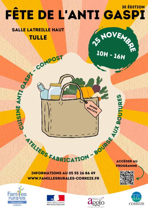 Programme : Atelier cuisine anti gaspi : Familles Rurales Corrèze - Atelier compost : Tulle Agglo - Fabrication de produits cosmétiques naturels : Centre Permanent d'initiative à l'environnement (places limitées) - Fabrication d'éponges Tawashi : Familles Rurales Corrèze - Fabrication de carrés démaquillants et bouillotes sèches : Familles Rurales - Atelier Furoshiki : Tulle Agglo - Fabrication de peinture et pâte à modeler maison : Familles rurales - Démonstration de customisation de meubles - Bourse aux boutures -