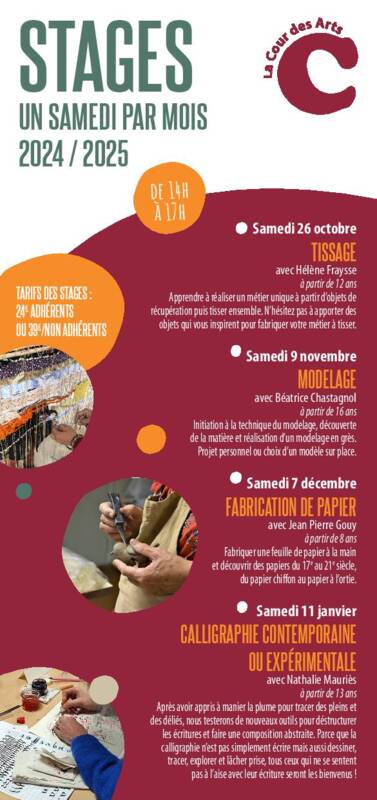 Stage calligraphie contemporaine ou expérimentale avec Nathalie Mauriès - À partir de 13 ans. Après avoir appris à manier la plume pour tracer des pleins et des déliés, nous testerons de nouveaux outils pour déstructurer les écritures et faire une composition abstraite. Parce que la calligraphie n'est pas simplement écrire, mais aussi dessiner, tracer, explorer et lâcher prise, tous ceux qui ne se sentent pas à l'aise avec leur écriture seront les bienvenus ! Sur inscription. Tarifs : 24 € adhérents/ 39 € non adhérents.