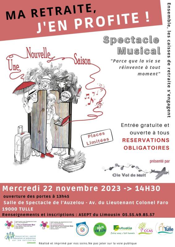 L'ASEPT (Association de Santé d'Éducation et de Prévention sur les Territoires) du Limousin, la CFPPA (Conférence des Financeurs de la Prévention de la Perte d’Autonomie des personnes âgées) de la Corrèze et leurs partenaires organisent une pièce de théâtre humoristique et musicale autour de la thématique du bien vieillir, « Une nouvelle saison » jouée par la Compagnie Vol de Nuit. « Sur fond d’enquête policière menée par deux inspecteurs genre « pieds nickelés », quatre jeunes retraités font vivre musicalement un lieu associatif ou se croisent au rythme des saisons de multiples personnes. « Au Potes Agés », on rit, on cause, on chante surtout et on explore les pistes d’une retraite heureuse. »