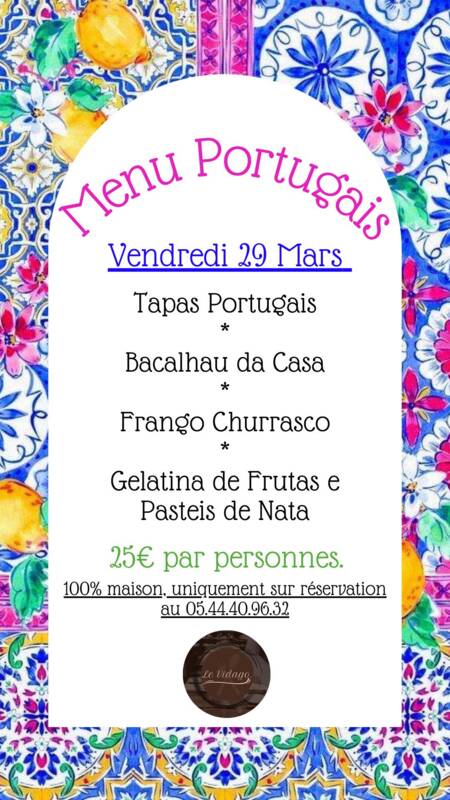 Le Vidago et son équipe proposent un menu aux couleurs portugaises. Repas 100 ù maison aux saveurs de chez nous. Sur réservation -