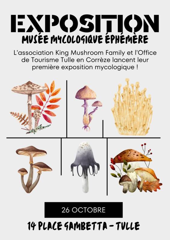 L'association King Mushroom Family et l'Office de Tourisme de Tulle en Corrèze lancent leur première exposition mycologique ! Venez découvrir plus de 30 variétés différentes de champignons sur la place Gambetta de Tulle. Un guide spécialisé et des fiches explicatives seront à votre disposition pour toute question