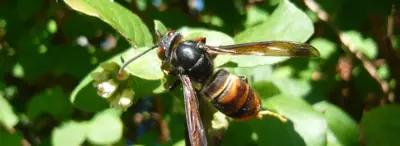 Le frelon asiatique, prédateur de nos abeilles, se différencie de son cousin européen par sa taille plus petite, ses pattes jaunes et ses couleurs plus foncées.