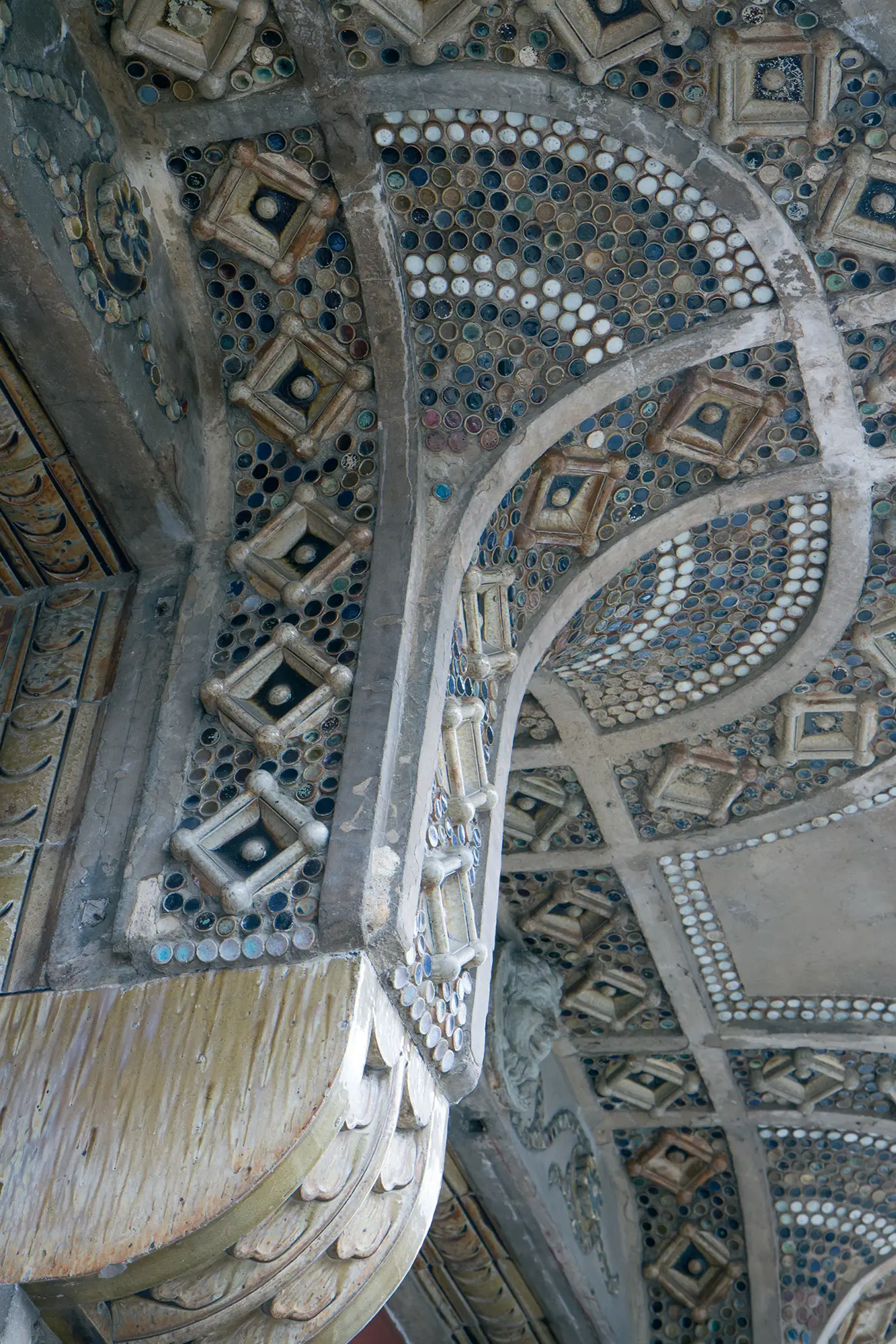 La sous-face du balcon aux formes ondulantes est entièrement incrustée de petites pastilles bleues et blanches en verre et en céramique. Nous devons cette mosaïque au céramiste Alexandre Bigot à qui Joseph Auberty et Anatole de Baudot, architectes du théâtre, avaient commandé cet ouvrage.