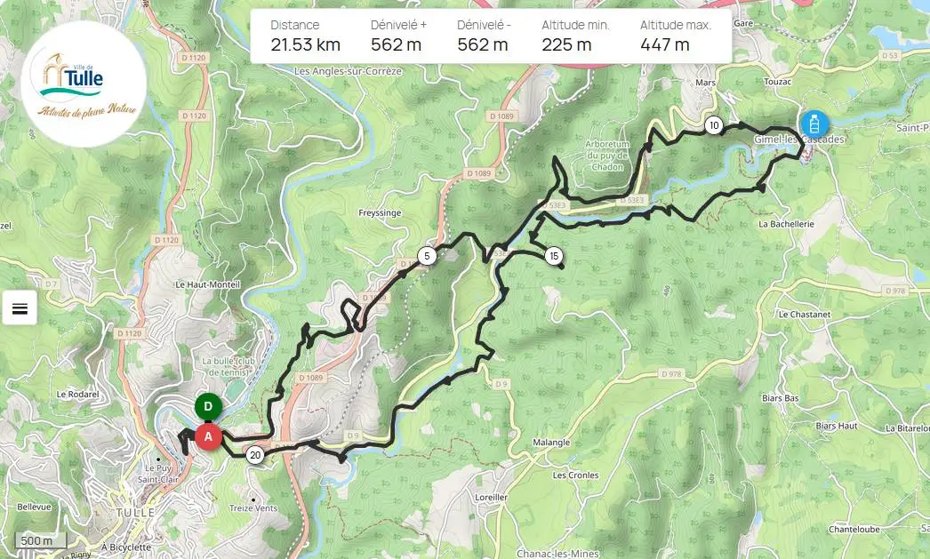 Départ de l'Auzelou. Attention après le pont des soldats, prendre la Départementale pour avoir une montée plus facile, jusqu'au km 2. Prendre l'ancienne voie romaine, rejoindre les hauteurs de Tulle au SDIS. Après km 5, une descente technique sur un mono trace. En bas, il faut rejoindre la route de Gimel. Remonter ensuite dans la Forêt de Chadon. Ensuite, prendre la direction de Gimel les cascades. Petite zone de portage du VTT sur les marches juste avant Gimel. Profitez de la vue dominante à Gimel. Redescendre ensuite par un chemin technique jusqu'en bas de la Montane. Après le km 13 deuxième zone de portage sur 10m. On se retrouve dans les bois de Panissaut, en bordure de la Montane. Reprendre la route, jusqu'au Pont de la Prade, puis le chemin de l'official. À St-Adrian dernière descente, faire attention lors de la traversée de la route départementale.